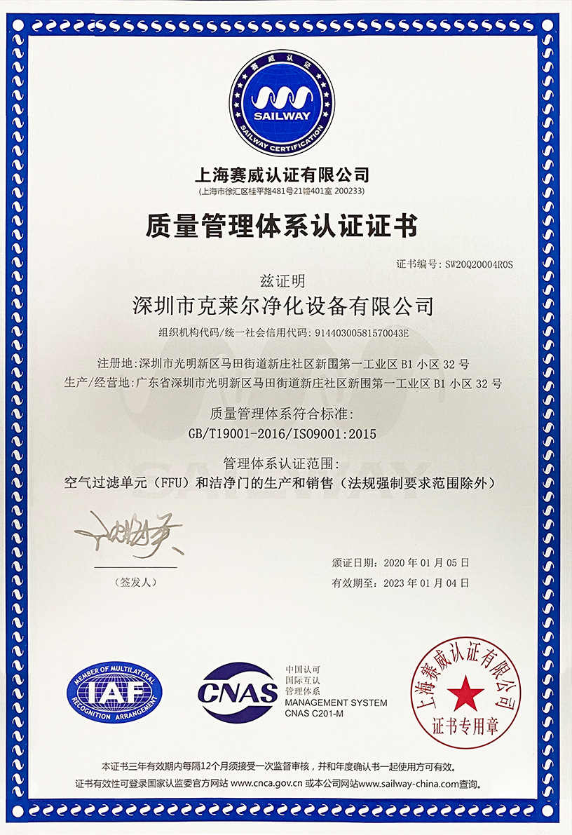 廣東克萊爾潔凈科技有限公司是一家集生產、研發、銷售于一體的專業潔凈門窗生產企業。 公司擁有現代化標準廠房10000多平方米,配備全自動靜電噴涂流水線及 3000平以上萬級無塵生產車間,專供潔凈門及中空窗的生產裝配等。公司不斷引進一流生產設備(如瑞士百超激光切割機、日本AMADA數控折彎機、超聲玻璃清洗機等),采用國際最先進的技術及裝備確保產品品質,是華南區域最具規模的專業潔凈鋼制門及中空潔凈窗生產廠家。公司在同行業率先通過ISO9001質量體系認證,并先后獲得多項專利認證及榮譽證書。 KLE purification equipment Co., Ltd. is a set of production, research and development, sales in one of the professional clean doors and windows production enterprises.The company has a modern standard workshop of more than 10000 square meters, equipped with automatic electrostatic spraying line and more than 30 million level dust-free production workshop, specially for the production and assembly of clean doors and hollow windows. The company constantly introduces first-class production equipment (such as Swiss Baichao laser cutting machine, Japanese AMADA CNC bending machine...